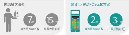 服務(wù)員可手持聚食匯·移動POS直面顧客進(jìn)行點(diǎn)單、收銀操作,避免服務(wù)員來回往返于餐桌和收銀臺之間,縮短服務(wù)時間并提高用戶就餐體驗,聚食匯·移動POS點(diǎn)餐收銀比傳統(tǒng)點(diǎn)餐收銀平均每桌節(jié)約時間12分鐘。